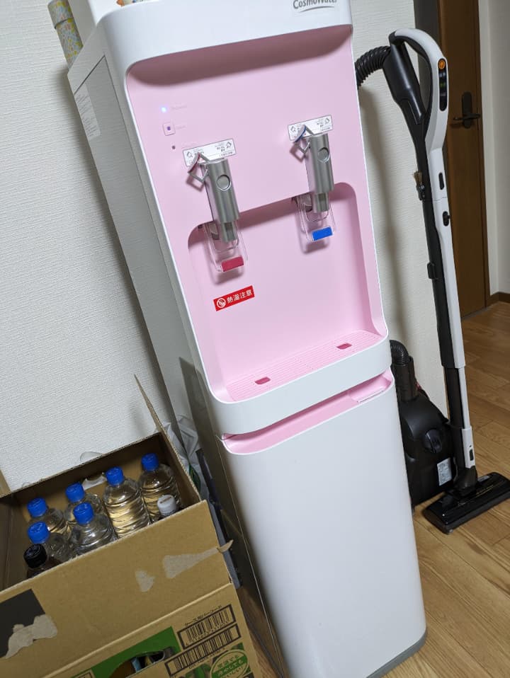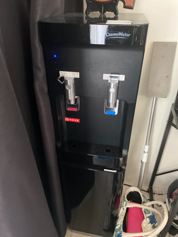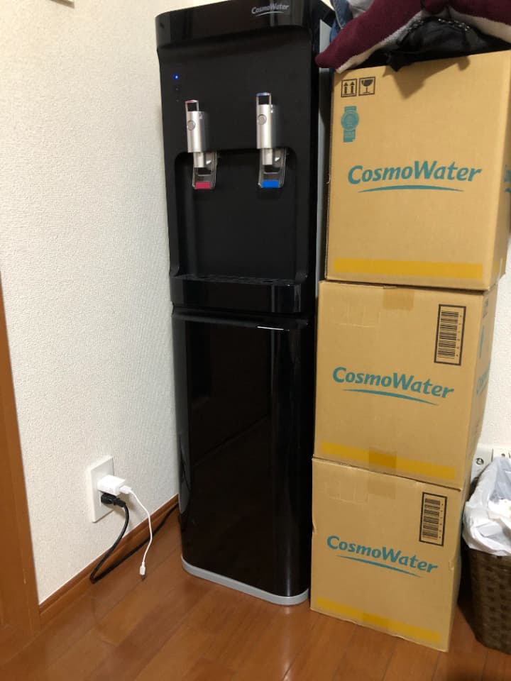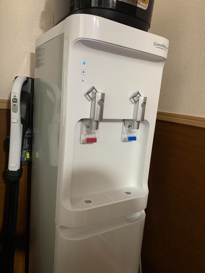 | 良い点 コスモウォーターのウォーターサーバーを我が家で採用した理由は、使いやすさからです。 美味しい水が冷たいor温かい状態で、押すだけで出て来る手軽さで、採用して良かったなぁと思っています。 そして重たい水を上まで乗っける事をしなくていいのも魅力の一つです。 身長が小さく、力もない私なので友人が使っていたウォーターサーバーのように上に持ち上げて設置するタイプだと大変でしたが、コスモウォーターのサーバーはしたの扉を開けバケツのようなトレイにセットするだけで水の交換ができ、女性でも手軽に使える所です。 | |