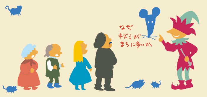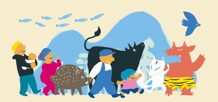 「人々が夢を抱けるような社会になってほしい」という願いは、子どもからお年寄までの人々やさまざまな動物として。