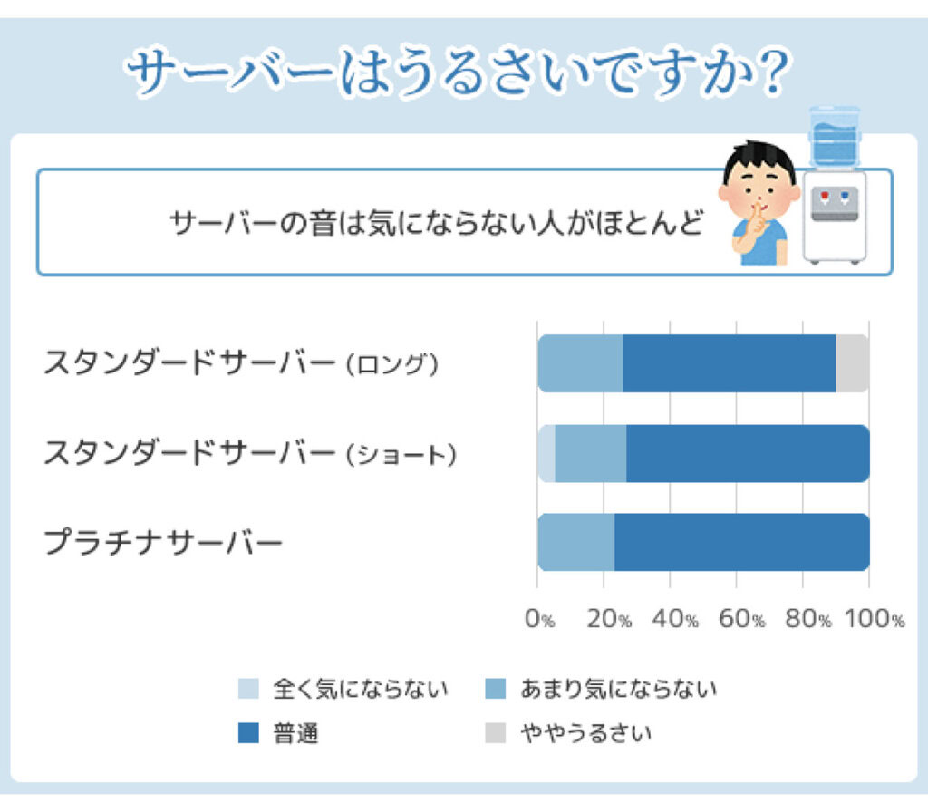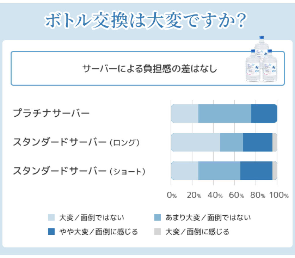 スタンダードサーバーは上置き、プラチナサーバーは下置きのボトル交換ですが、アンケートの結果ではボトル交換の大変さに大きな差は見られなかったのが意外でした。
